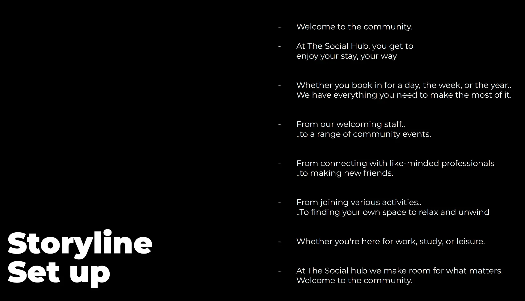 For this campaign, I developed multiple creative concepts for the client to choose from, collaborating closely with a copywriter who brought the storyline to life. In addition to shaping the full concept, I created an extended storyboard, concept decks, and provided essential pre-production art direction. On set, a fellow art director handled the art direction at The Social Hub’s Glasgow location.